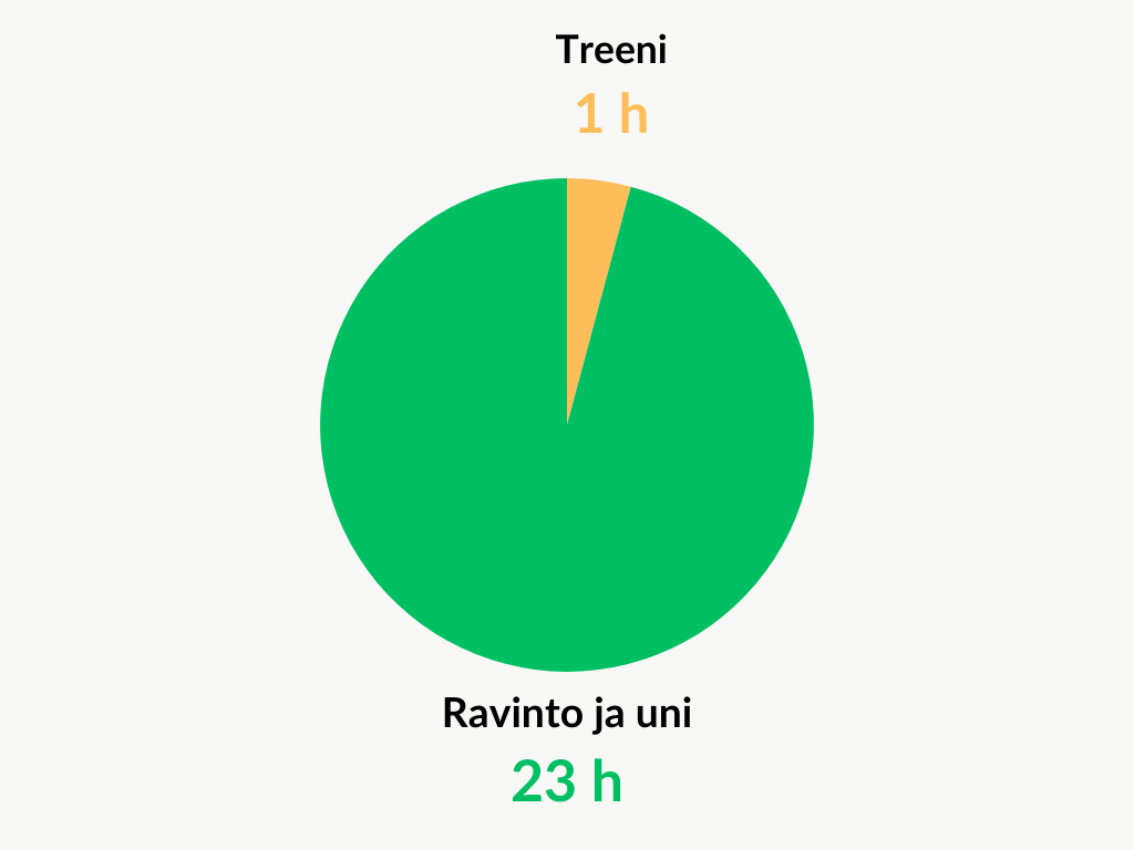 Liikunnan osuus painonpudotuksessa on loppujen lopuksi melko pieni. Jos treenaat päivän aikana tunnin verran salilla, niin ratkaisevaa on se, mitä teet ne loput 23 tuntia päivästä!