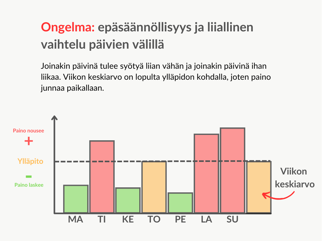 Yksi yleinen ongelma ja haaste on se, että energiansaanti on epäsäännöllistä ja vaihtelee liikaa päivästä toiseen.