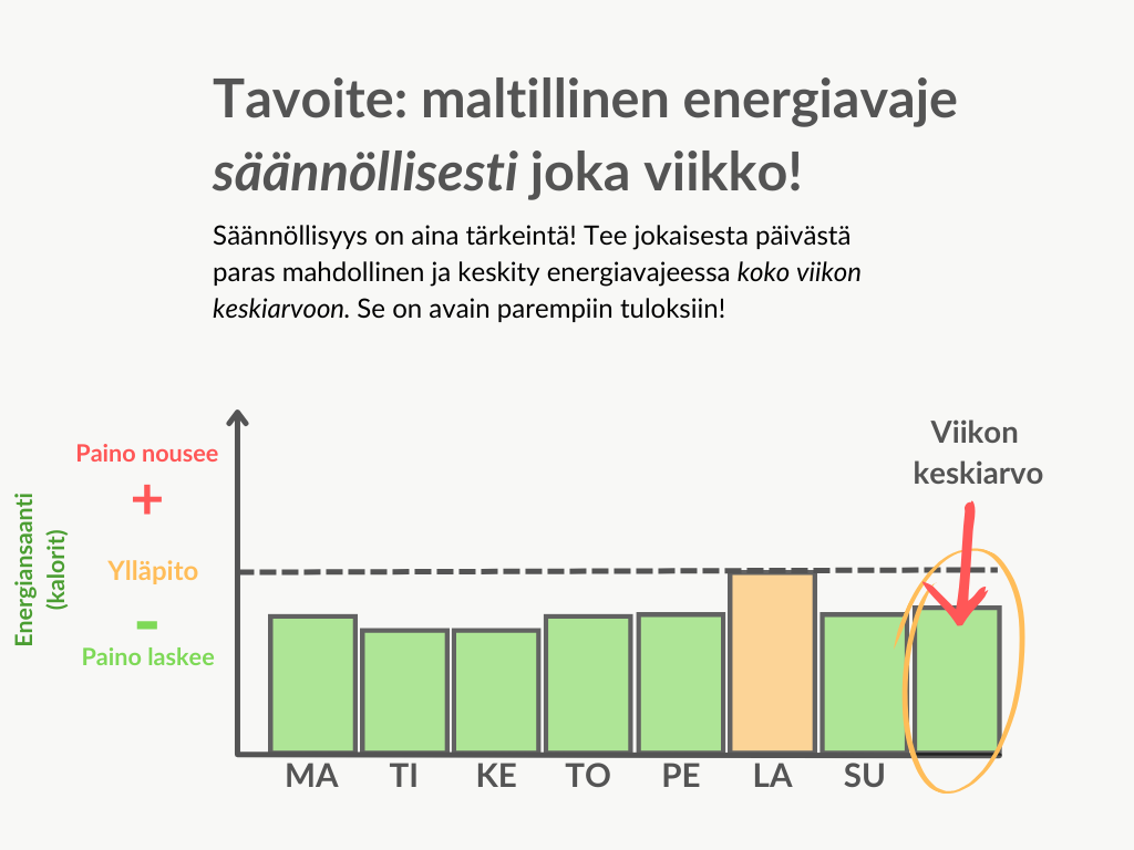 Jälleen: ei riitä, että olet yhden päivän energiavajeessa. Sinun täytyy olla koko viikon ja koko kuukauden ajan "miinuksella", jotta tuloksia alkaa syntymään!